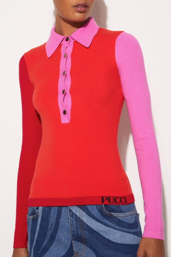 Embracing the electric combination of pink, orange and red, this sweater shows Pucci’s maximalist approach to colour. It’s cut to a slim-fitting silhouette and finished with a large point collar that evokes styles of the 70s.