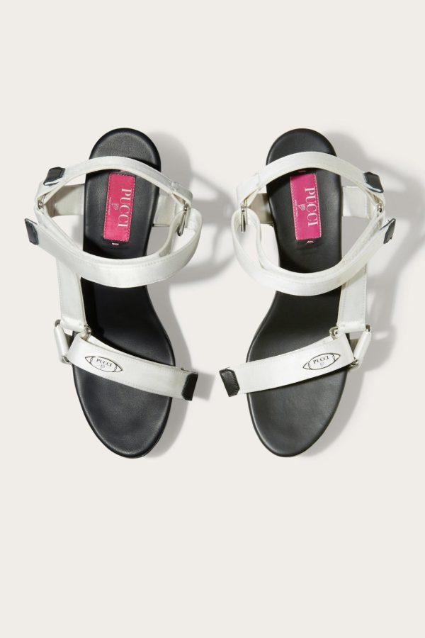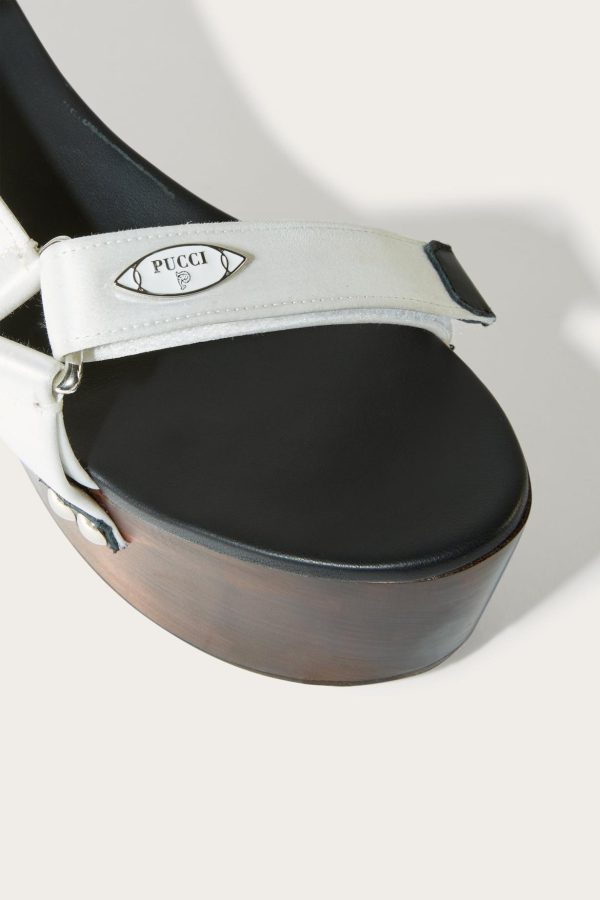 Pucci channels the bold spirit of the 70s with these wooden platform sandals. The adjustable hook and loop straps are made from smooth satin and are finished with a polished logo plaque at the front.