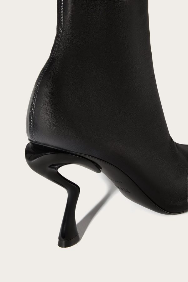 These boots combine a sleek leather upper with a sculptural heel, which is shaped to resemble a horse’s leg. They feature side zip strung with signature Pucci P pulls.