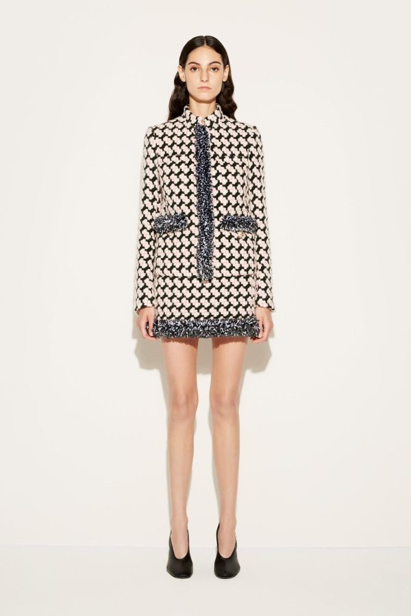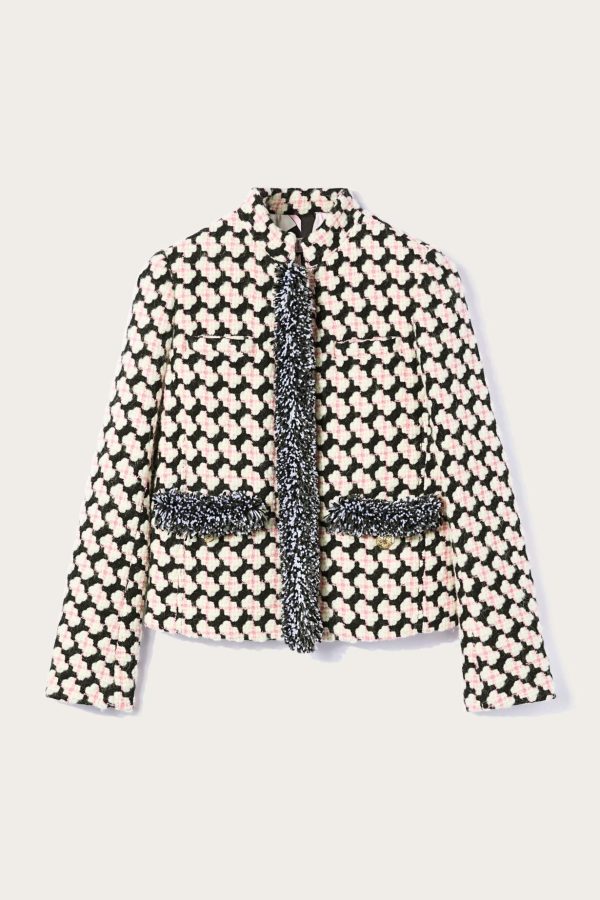 Combining a tailored silhouette with lighthearted textural elements, this jacket exemplifies Pucci’s playful design philosophy. It’s cut from tweed with a geometric pattern and trimmed with fluffy fringing.
