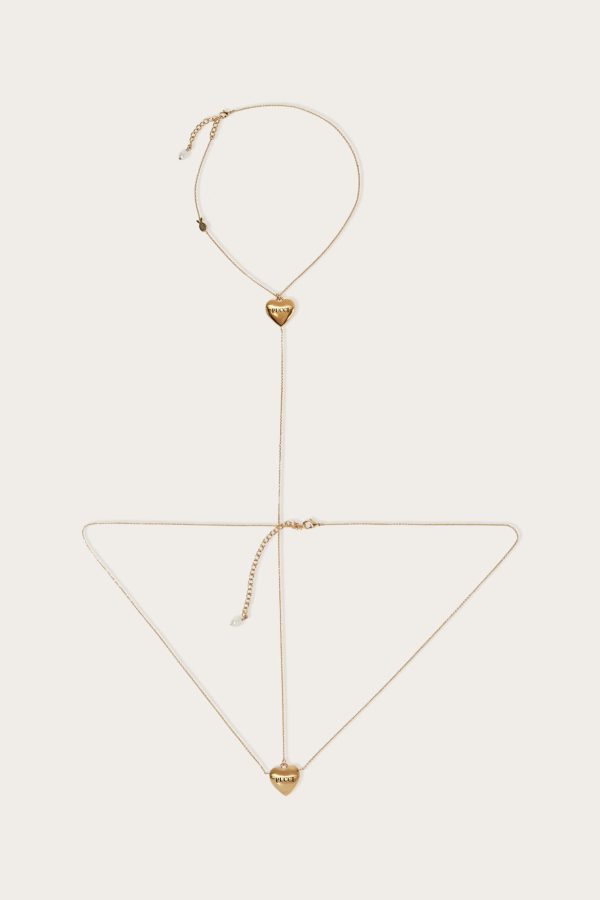Pucci’s gold-tone body chain fuses the house’s playful DNA with Miceli’s accessories expertise. Two heart-shaped pendants are strung from slim rolo links. Note the intricate intertwined fish and logo engraving.