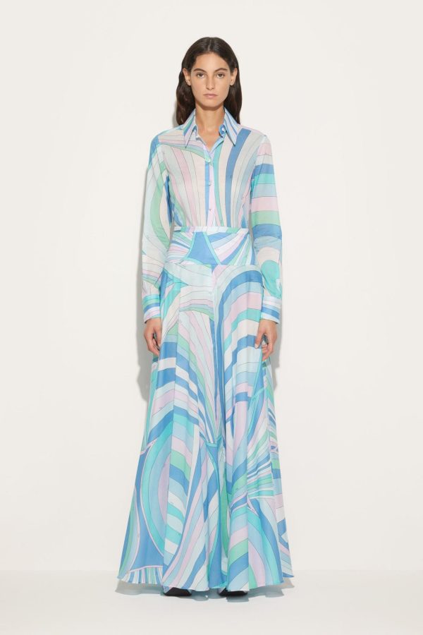 A celebration of Pucci’s storied pattern play, this skirt is decorated with the Iride print in a pastel colour palette. It’s cut from swathes of cotton to a pleated silhouette that flares out at the hip.