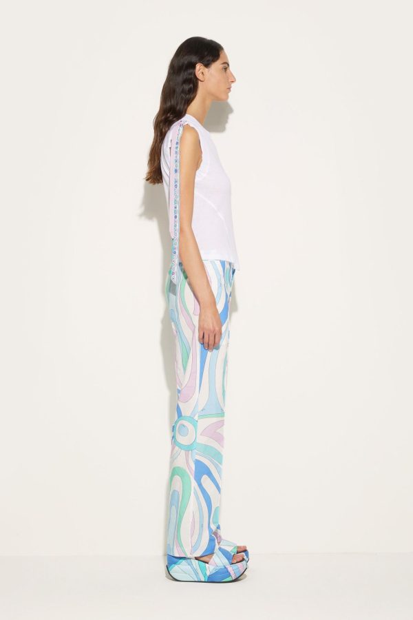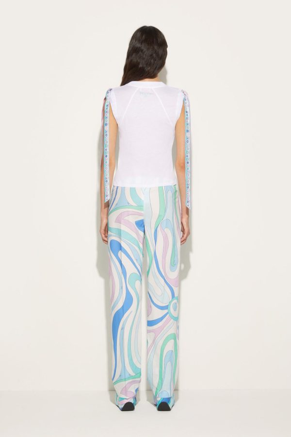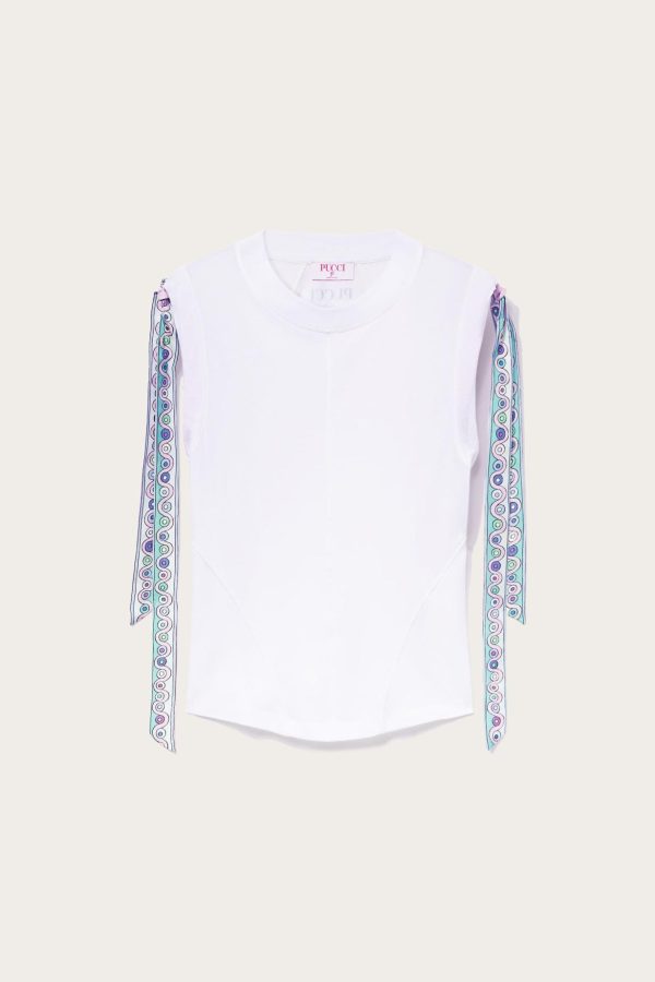 This T-shirt is an ode to Pucci’s storied scarves: it’s threaded with Iride-print ties at the shoulders. The house’s moniker and intertwined fish motif stamp the back.