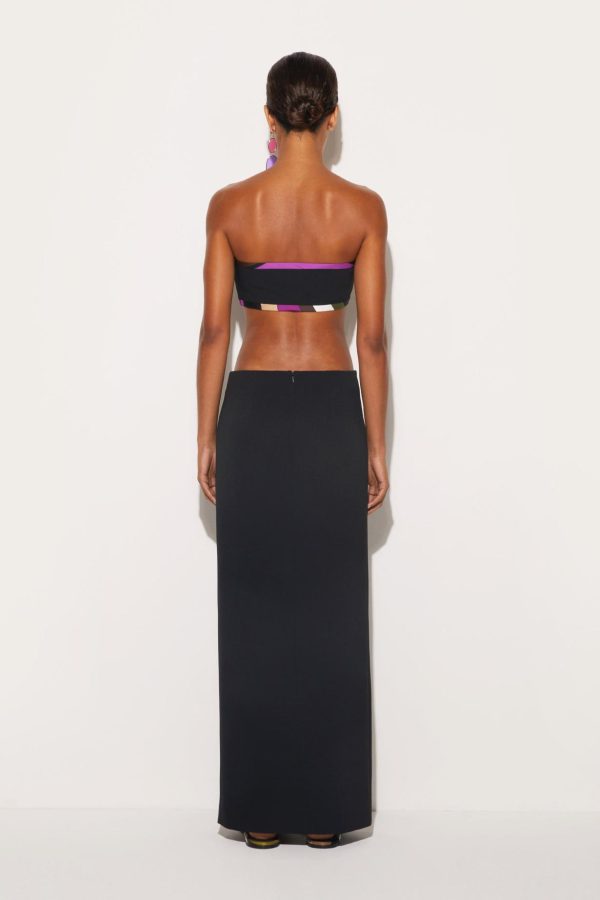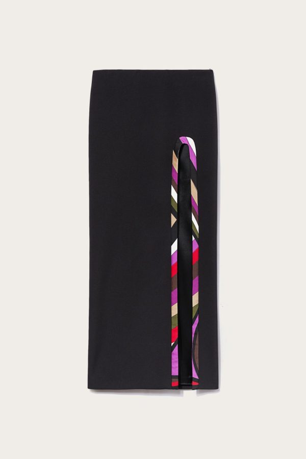 Iride-print trims lend a hit of vibrancy to this long black skirt. It’s cut to a column silhouette with the colour-block pattern tracing the curved side split.