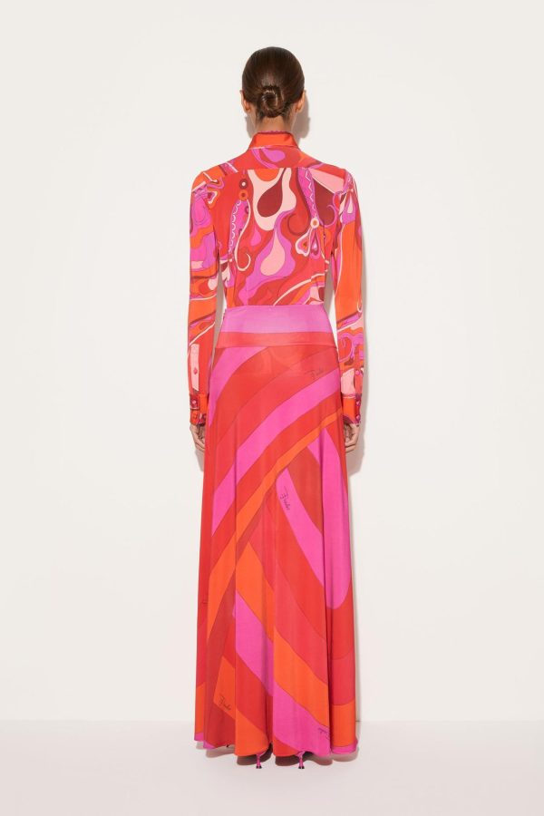 Pucci’s iconic Iride print adorns this long skirt in a variety of bold shapes and bright colours. Its billowing silhouette is crafted from fluid jersey satin and cascades to a floor-sweeping hem.