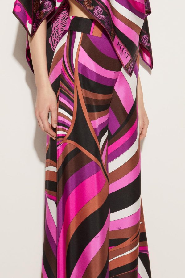 These trousers celebrate Pucci’s maximalist mood: they’re stamped with the Iride print in rich purple and brown hues. An impactful silhouette, they’re cut from silk twill to an exaggerated wide leg that falls to a sweeping floor length.