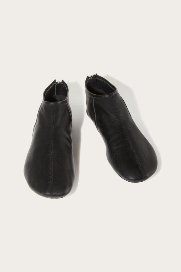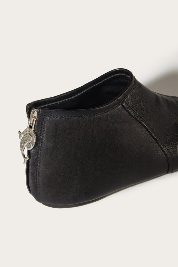 Showcasing Pucci’s range of eclectic influences, Camille Miceli reimagines the flat shoes in a minimalist silhouette. The pair is crafted in soft nappa leather and detailed with the house’s signature Pucci P at the zip pull.
