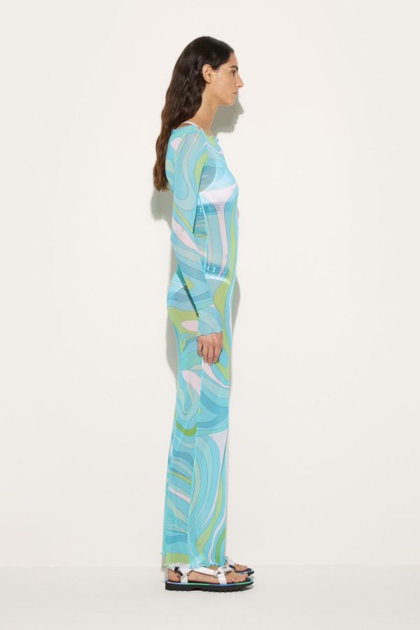 Reminiscent of the Mediterranean Sea, the swirling waves of the Marmo print wash over this dress in turquoise and blue. Its full-length silhouette is detailed with lettuce-hem trims and a semi-sheer finish.