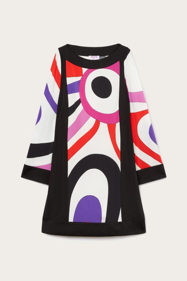 This shift dress evokes the spirit of the 60s. Designed with Pucci’s signature boat neckline, it’s splashed with the storied Marmo print in a medley of vibrant colours.