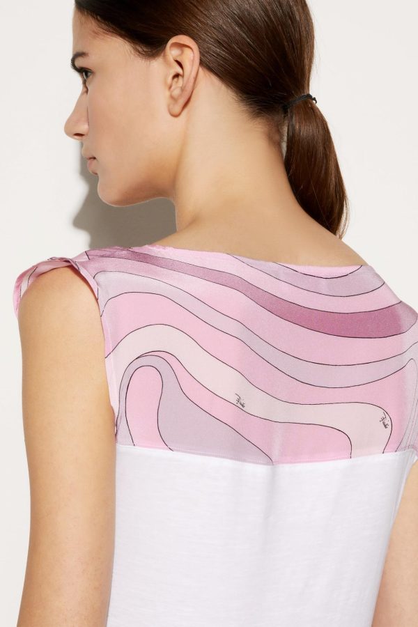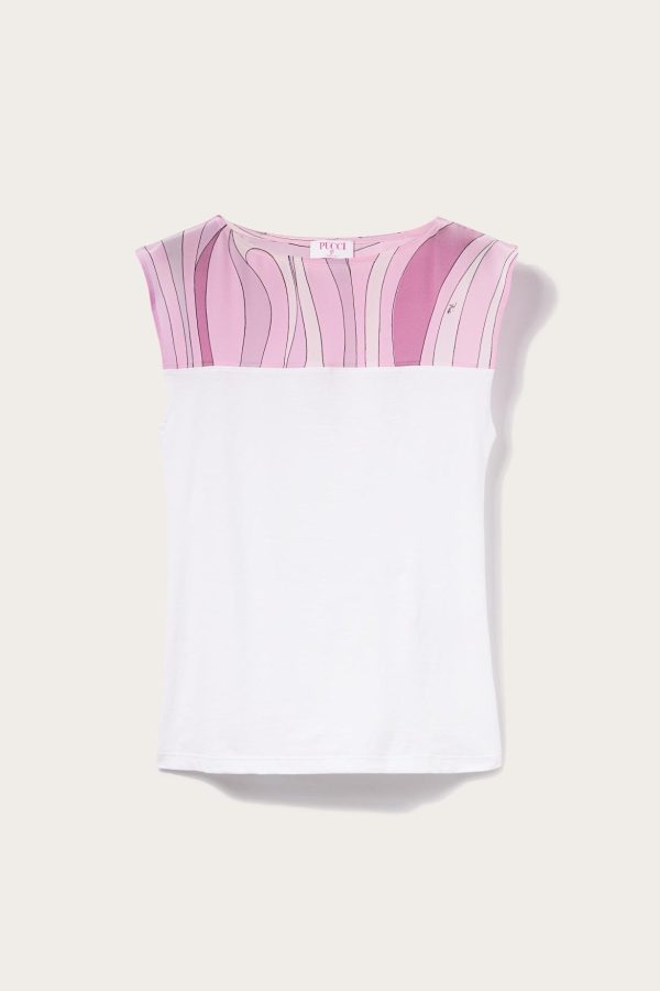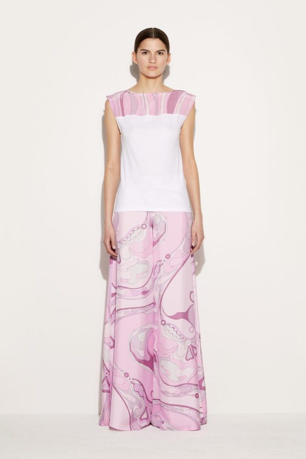 A classic cap-sleeved T-shirt enlivened by Pucci’s storied Marmo print: this design has both versatility and vibrancy. It’s cut from cotton and overlaid with a patterned silk panel at the shoulders.