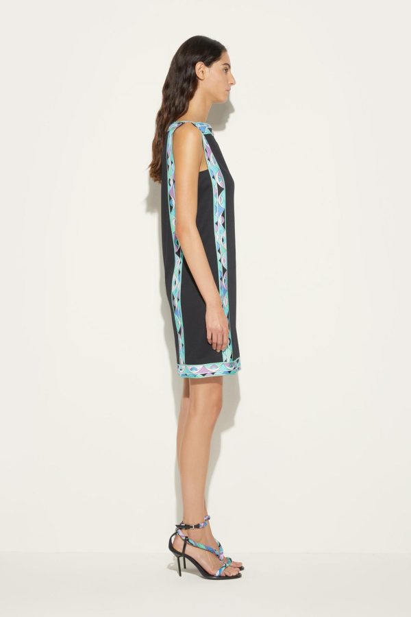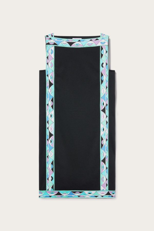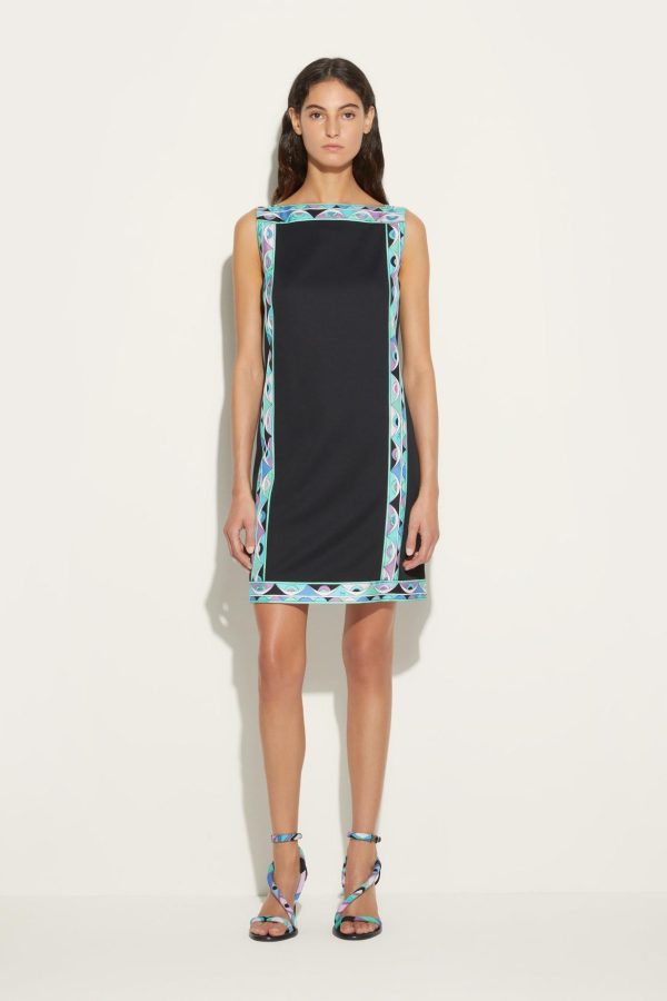 This black shift dress is cut from fluid jersey crepe to a clean, minimalist silhouette. Pucci’s famed pattern play shines at the edges, which are framed with an intricate pastel-hued Vivara print.