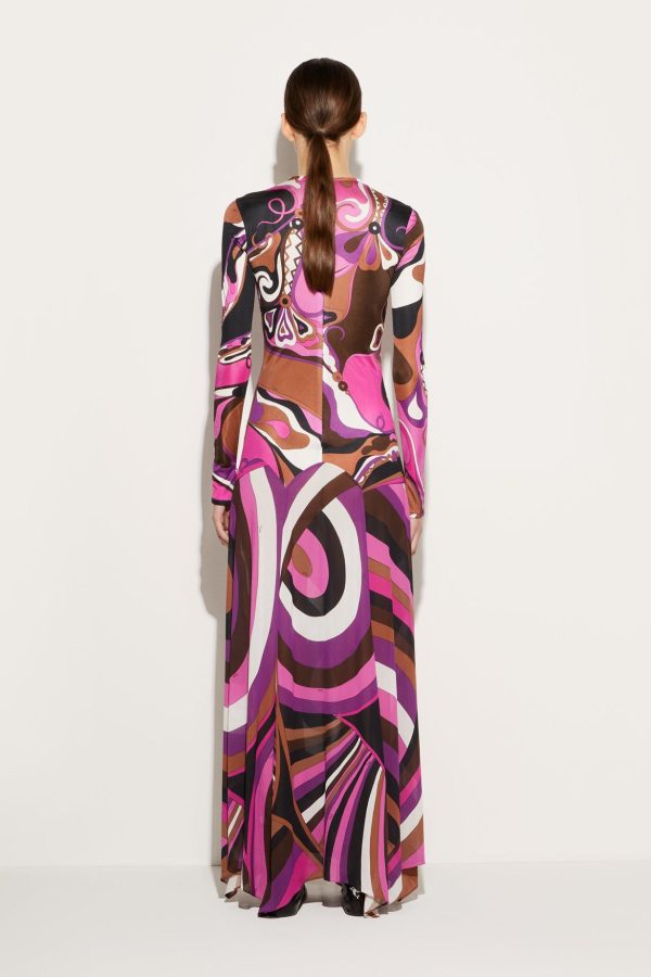 Adorned with two of Pucci’s most energetic prints, the Orchidee and the Iride, this dress is awash with vibrant pattern play. It’s cut from a sleek jersey satin that fits close to the body and falls to a long skirt with fluid movement.