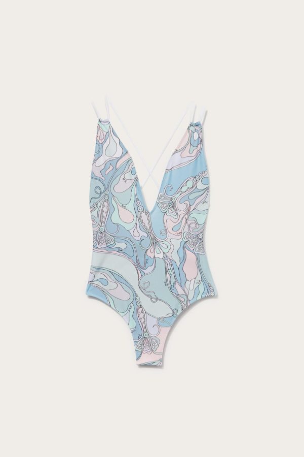 Pucci dives into pattern play with this swimsuit, which is adorned with the floral-inspired Orchidee print. It’s crafted from UV-protective eco-LYCRA® with a plunging V-neck and an open back with slim crossover straps.