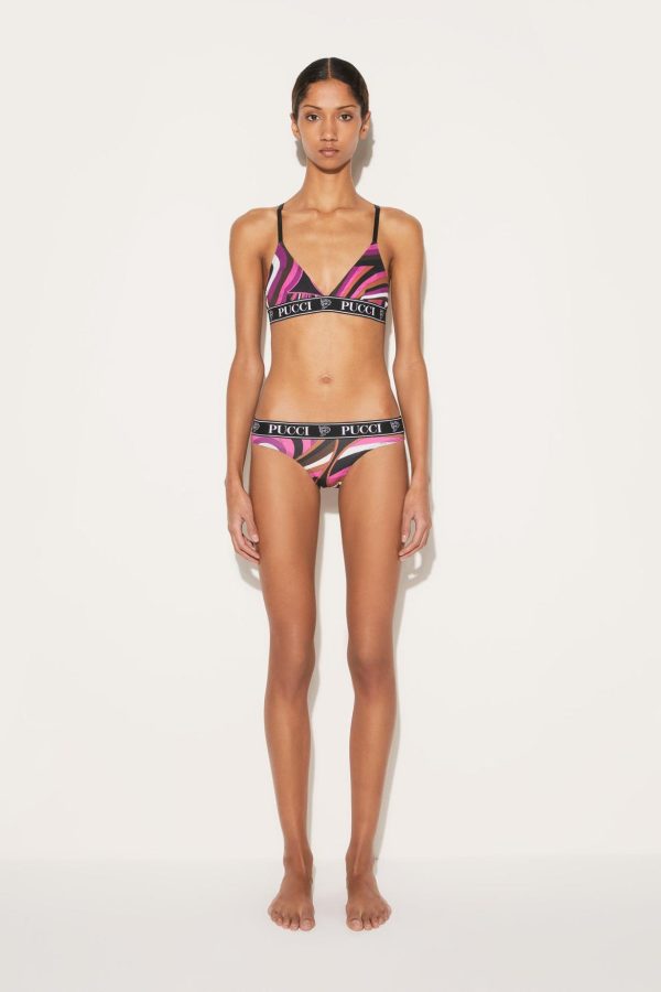 The triangle bras in this pack are fitted with an elastic underband that’s jacquard-woven with the house’s moniker and Pucci P motif. One is decorated with the Iride print, while the others come in white and black.