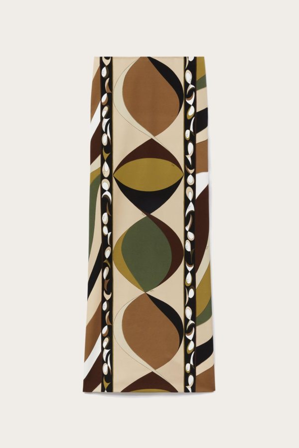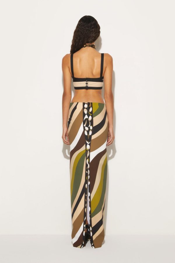 This long skirt is covered in winding curves, courtesy of Pucci’s Mediterranean-inspired Pesci print. It’s cut from technical couture fabric and falls from a high waist to a clean column silhouette.