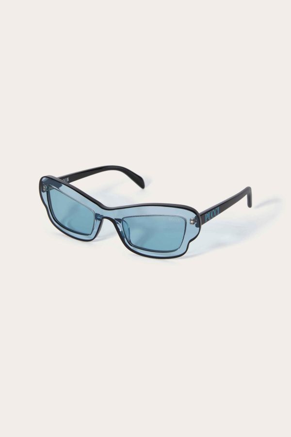 Showcasing Pucci’s confident spirit, these sunglasses feature an enlarged rectangle frame with a straight upper and oversized temples. They’re crafted from glossy black acetate and enlivened with the Iride print at the back.