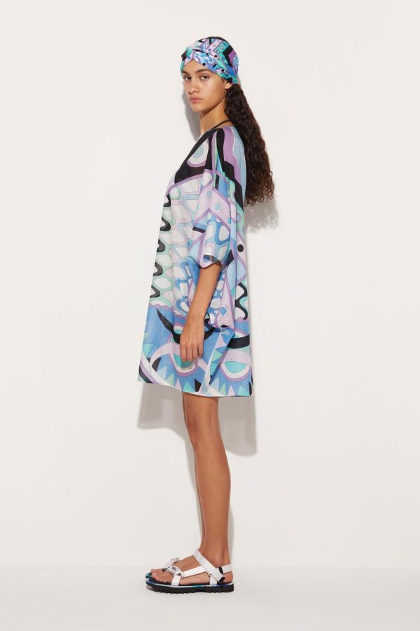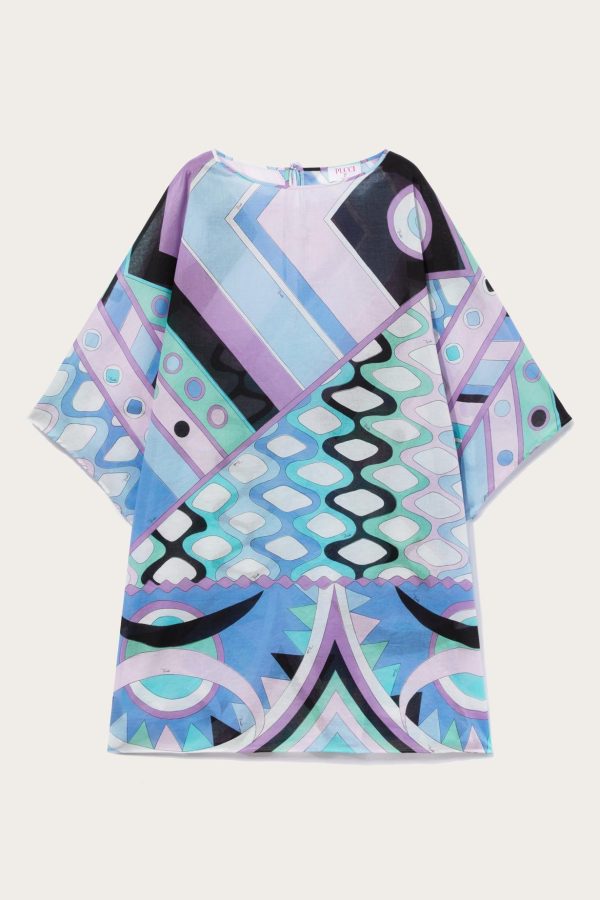 Kaleidoscopic patterns on fluid fabrics are a Pucci signature, and this kaftan is a case in point. It’s cut from diaphanous cotton muslin to a loose silhouette and is decorated with the archival Vivara print.